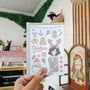 This sticker sheet's design includes one doll and a variety of items related to the theme. It was the shop's first category and its all-time favorite category across its different sales channels.