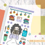 This sticker sheet's design includes one doll and a variety of items related to the theme. It was the shop's first category and its all-time favorite category across its different sales channels.