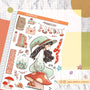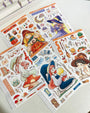 This sticker sheet's design includes one doll and a variety of items related to the theme. It was the shop's first category and its all-time favorite category across its different sales channels.