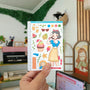 This sticker sheet's design includes one doll and a variety of items related to the theme. It was the shop's first category and its all-time favorite category across its different sales channels.