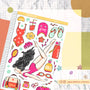This sticker sheet's design includes one doll, and a variety of items related to the theme. It was the shop's first category and its all-time favorite category across its different sales channels.